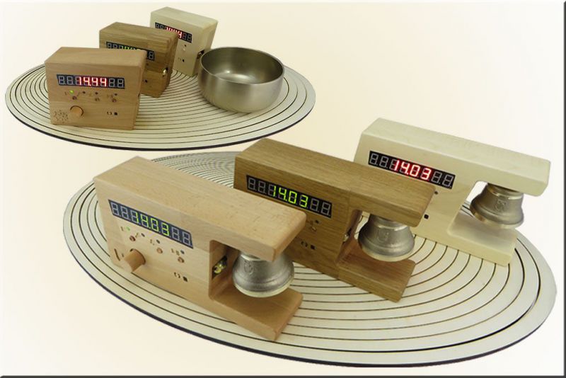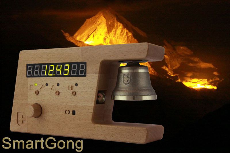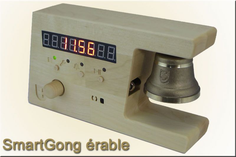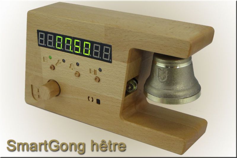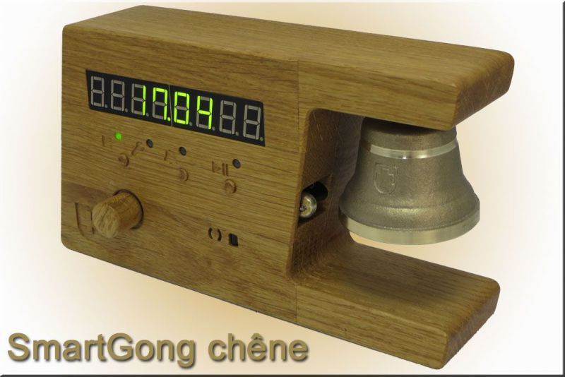 Bois massif ciré, cloche en bronze. Modèle numéroté. Construit avec soin le SmartGong défie le temps. Horloge, minuterie, carrillon et réveil avec cloche en bronze. Minuterie de méditation avec cloche en bronze. Manuel d'utilisation (pdf)